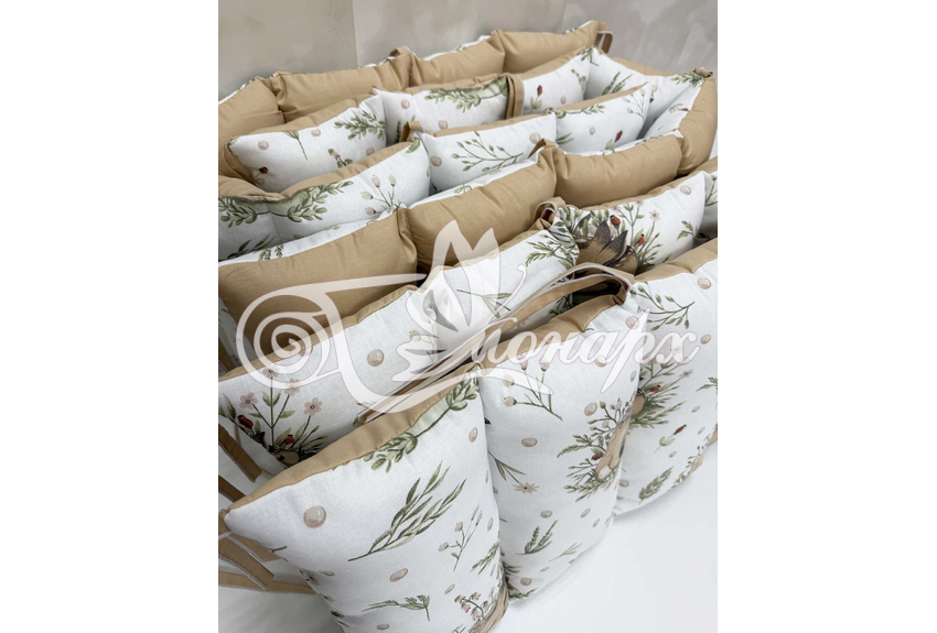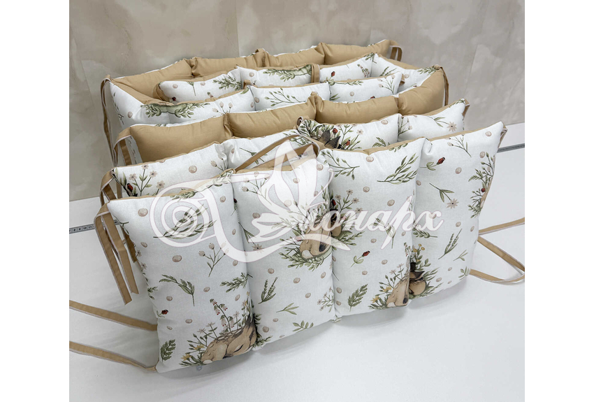 • Бортик-заборчик стеганый с синтепоном, плотно забит синтепухом (на замочках): - 2 шт. 60х34 см / - 2 шт. 120х34 см.